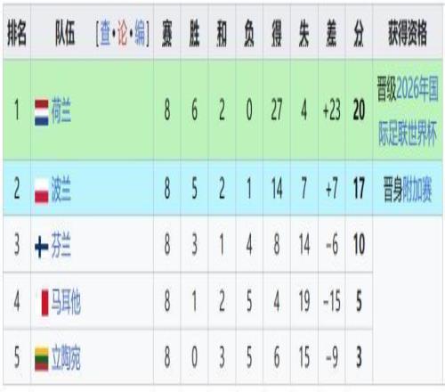 今晨世预赛欧洲区G组末轮,荷兰主场4比0击败立陶宛,顺利拿到直接出线的资格。本组波兰队进入附加赛。